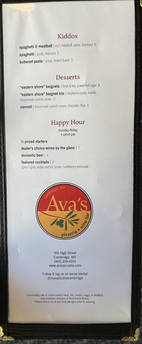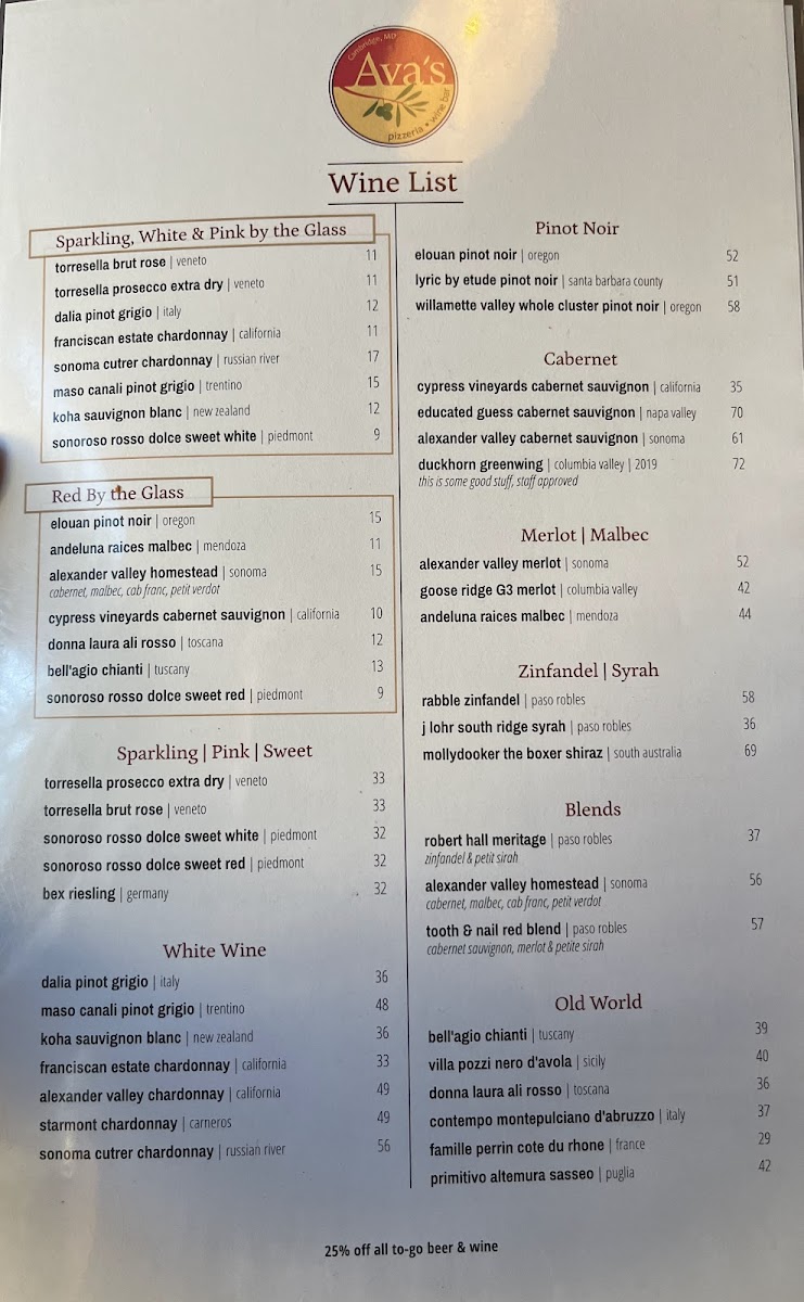 At Ava's Pizzeria & Wine Bar - Cambridge Menu, you'll find a delightful mix of freshly crafted pizzas, flavorful pasta dishes, and a curated selection of wines perfect for any occasion. Whether you're stopping by for a casual bite or a night out with friends, the menu offers something for everyone. Enjoy classic Margherita or indulge in creative options that are sure to satisfy your cravings. For those looking for a little extra, the wine list perfectly complements each dish, providing a great pairing for your meal. From the first bite to the last sip, dining here feels like a cozy escape, with a variety of options to suit any appetite.